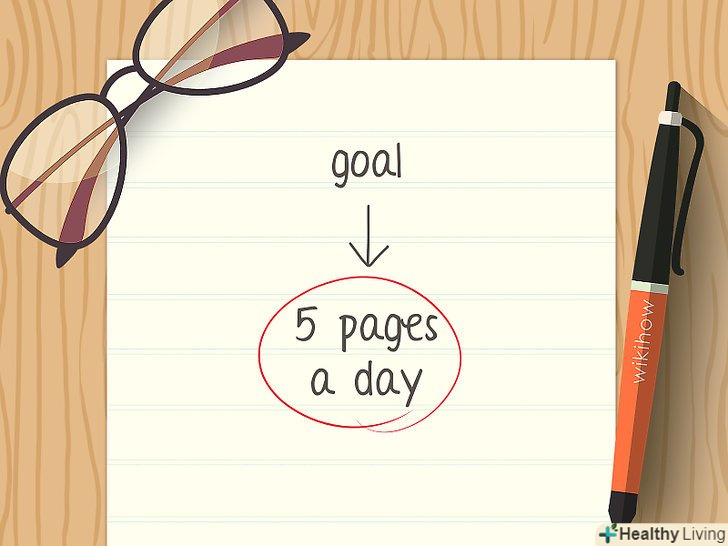 Визначте часові рамки або цілі.Ваш начальник, викладач, видавець або навіть ви самі можете поставити крайній термін завершення роботи. Використовуйте такий термін, щоб ставити письменницькі цілі відповідно до графіка. Заплануйте час на роботу, перевірку, правки, ознайомлення з відгуками і доповнення.[9]- При наявності вільного терміну можна задатися метою писати 5 сторінок або 5000 слів в день.