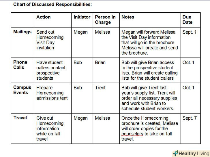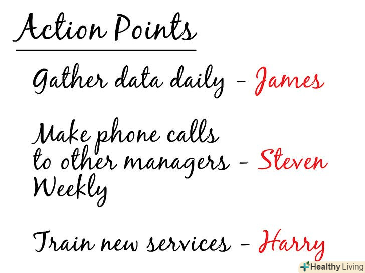 При обговоренні дій зверніть увагу на те, хто взяв на себе обов'язок виконати завдання, і вкажіть саме завдання.Запишіть всі важливі речі, які відбуваються під час зустрічі.