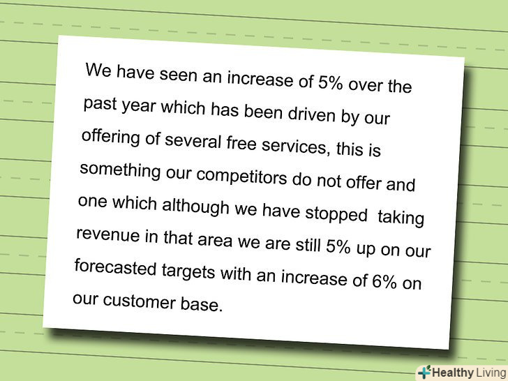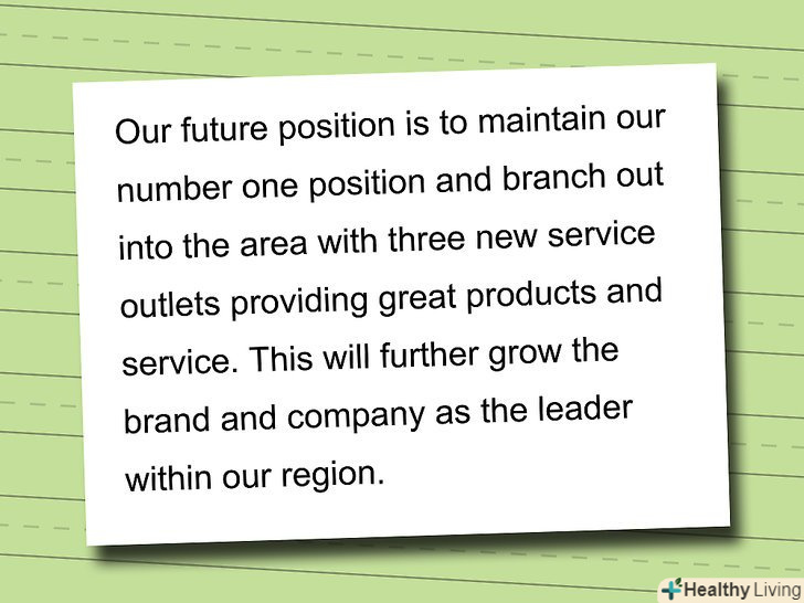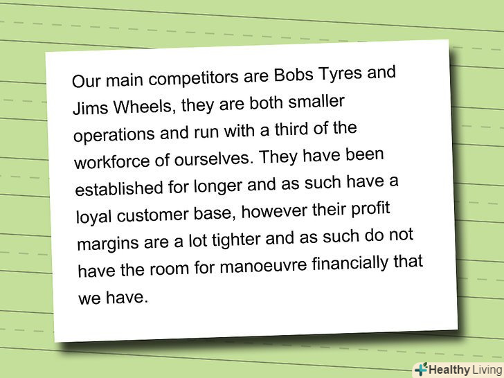 В останній частині аналізу ще раз побіжно опишіть конкуренцію, загальні тренди і те, як ваш бізнес має намір задовольнити ринковий попит, вигідно відрізняючись від конкурентів.