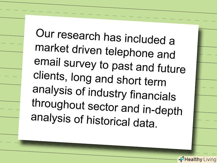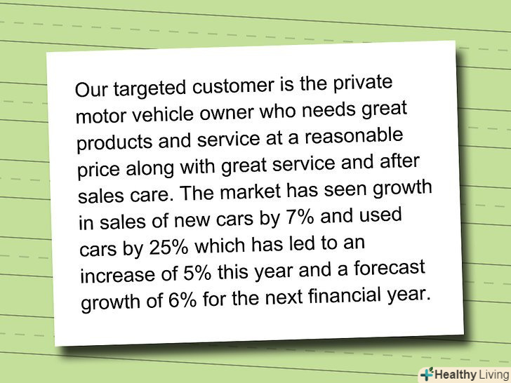 Аналіз ринку-важливий розділ бізнес-плану, що містить інформацію про передбачуваний торговий ринок, переваги покупців і інформацію про конкурентів. Аналіз ринку ґрунтується на ретельному дослідженні ринку і призначений для того, щоб зацікавити інвесторів. Якісний аналітичний звіт підтвердить, чому ваша компанія стане істотним доповненням ринку і буде приносити прибуток. Ви зможете написати якісний аналіз ринку, керуючись наступними кроками, а також порадами, Як справити враження на інвесторів.