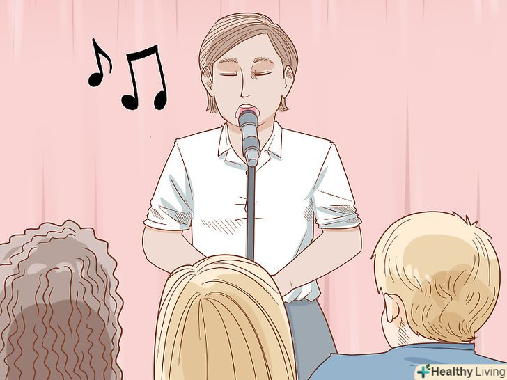 Співайте в присутності інших людей, щоб дізнатися думку з боку.якщо потрібна конструктивна критика, то спробуйте заспівати в присутності слухачів. Влаштуйте друзям і рідним невеликий концерт. Виступіть на відкритому мікрофоні, беріть участь в шоу талантів або сходіть в караоке. Знайдіть відповідне місце і співайте.[21]- Виберіть відповідне приміщення. У великій кімнаті з високими стелями ваш голос буде звучати краще, ніж в підвалі, підлога якого застелена килимом.