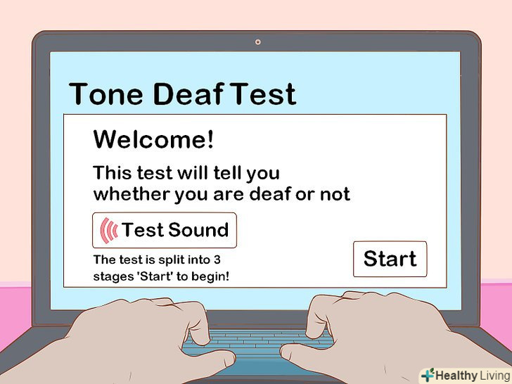 Пройдіть перевірку на музичну глухоту.Музична глухота-нездатність правильно сприймати висоту звуків. В інтернеті можна знайти кілька тестів, які дозволять вам виявити наявність такої проблеми.[18] дізнайтеся, чи здатні ви розрізняти високі і низькі ноти або ви входите в ті 1,5 % населення, які страждають від «амузії» і не можуть розпізнати висоту, тон і навіть ритм.[19]- Більшість онлайн-тестів складаються з декількох коротких уривків відомих пісень і мотивів. Прослухайте уривок, а потім вкажіть, чи правильно він був виконаний.