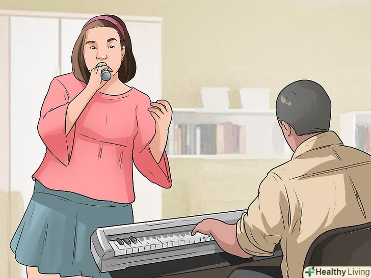 Практикуйте дихальні вправи. спробуйте практичний і вельми веселий Книжковий метод. Ляжте на підлогу і покладіть книгу на живіт. Співайте зручну ноту, і коли будете видихати / співати, намагайтеся зробити так, щоб книга піднімалася.[5]