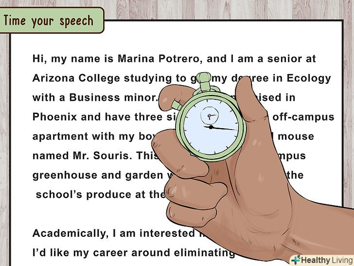 Засікайте тривалість мови. чотири або шість хвилин пролітають дуже швидко, тому засічіть час, коли будете репетирувати мова. Візьміть будильник, наручний годинник, смартфон або попросіть друга заміряти тривалість мови. Також друзям слід звертати увагу на слова-паразити на кшталт «значить», «отже», «ну». Ваша Вітальна мова не повинна бути занадто офіційною, але також вона не повинна здатися слухачам непідготовленою.[7]