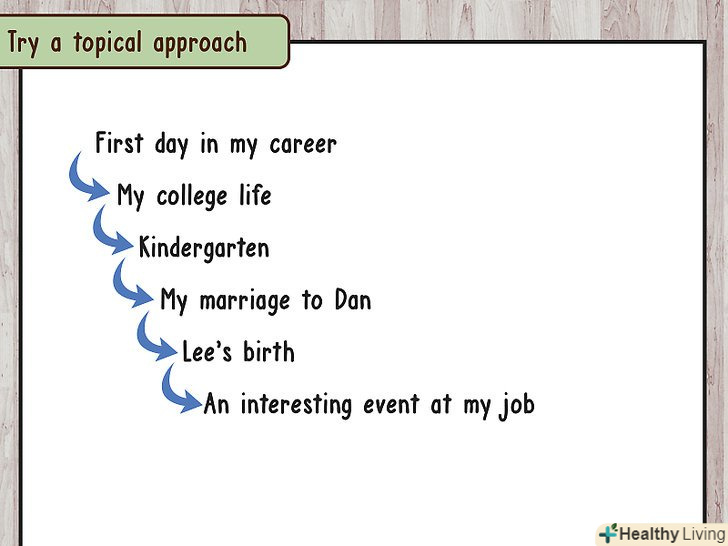 Зосередьтеся на важливих аспектах життя.також можна побудувати свою промову навколо важливих аспектів життя. Наприклад, розкажіть про свої захоплення, а не досягнення.[3]- Так, якщо ви ветеринар, можна розповісти про свого першого вихованця, першу роботу в притулку для тварин, рішення стати ветеринаром, нинішню роботу і домашніх вихованців.