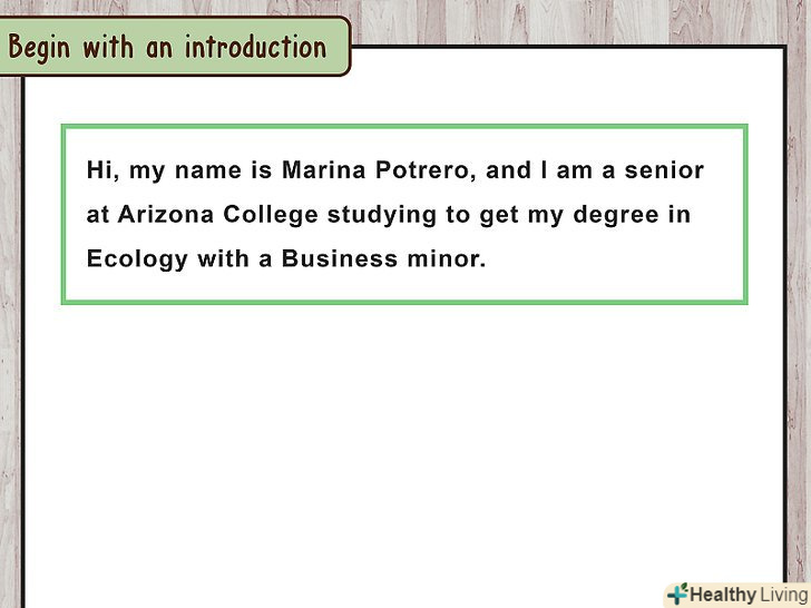 Почніть зВведення.перш за все необхідно назвати своє ім'я і коротко розповісти про себе в парі пропозицій. Можна привернути увагу слухачів за допомогою жарти, цитати або історії з життя, які зачіпають основну тему мови.[6]- Наприклад, при виступі на діловій зустрічі використовуйте цитату засновника компанії.