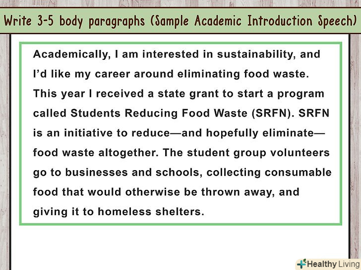 Напишіть 3-5 основних абзаців. кожен основний абзац повинен бути пов'язаний з темою мови. Не потрібно намагатися повідомити якомога більше інформації. Краще навести приклади того аспекту, про який ви хочете розповісти.- Наприклад, якщо мова присвячена тому, як ви стали лікарем, оскільки це переломний момент вашого життя, в першому абзаці розкажіть, як в дитинстві ви любили допомагати людям, у другому — про рішення вступити до медичного університету, а в останньому — про свої почуття в той момент, коли вас вперше назвали «лікарем».