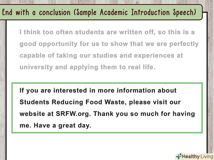 Напишіть заключну частину.висновок, як і вступ, має тривати до 30 секунд. Повторіть головні думки своєї промови і подякуйте Організатора Заходу або завершіть виступ мудрими словами.- Наприклад, якщо ви розповідали про те, як стали лікарем, то в кінці можна сказати: «дівчатка, які допомагають своїм подружкам промити садна, можуть Одного разу стати лікарями. Дякую за увагу. Бажаю гарного дня всім присутнім"»