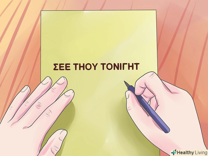 - Інший приклад: ви хочете написати "Побачимося ввечері". Зашифрувати цю фразу за допомогою грецького алфавіту можна так- " Гей, сьогодні урок грецького був хорошим. YβιΔιMςια βεψεРoM."Ми всього лише використовували грецькі букви: іпсилон і Віта заголовні, йота, дельта заголовна, знову йота, Мі заголовна і інші для зашифрування "Побачимося ввечері". У грецькому алфавіті немає деяких букв, які ми використовуємо в російській, тому використовуйте будь-які інші букви, які візуально схожі з потрібною Вам буквою. У грецькому немає букви "Ч", тому візуально ми може вибрати букву пси"ψ".