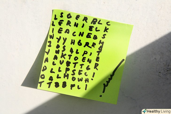 Створіть нову мову. якщо секретна записка призначена для однієї людини (або маленької групи людей), ви можете розробити "мову", де кожна буква замінюється на символ. Переконайтеся, що людина знає код, або у нього є список символів з розшифровкою. Він повинен бути легким для запам'ятовування, але досить загадковим, що ви не зможете його легко перевести. (Наприклад, A=1, B=2, C=3 - Дуже легкий код. Краще буде створити код, де A-завиток, Б-трикутник, с-зірочка і т. д)