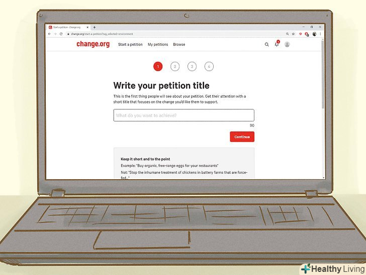 Поширюйте онлайн-петиції.завдяки інтернету (починаючи з клопотання), зараз не потрібно ходити по квартирах з ручкою і стосом паперів. Є безліч сайтів і платформ соціальних мереж, в яких розміщуються петиції. Щоб підтримати клопотання, необхідно:[11]- Створити чітку, конкретну і реалістичну мету — "захистити лісисту місцевість, яка прилягає до Парку ветеранів від забудови".