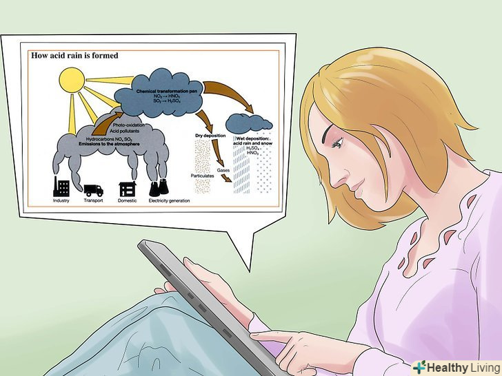 Вникніть в причини виникнення кислотних дощів.кислотні опади викликані такими хімічними речовинами як оксиди азоту і діоксиди сірки, які піднімаються високо в атмосферу і змішуються з киснем, водою та іншими атмосферними хімічними речовинами. Коли електростанції спалюють викопне паливо (вугілля, наприклад) для виробництва електроенергії, вони також випускають більшу частину діоксиду сірки та оксидів азоту, відповідальних за кислотні дощі. Ці ж хімічні речовини викидаються з вихлопами вантажних і легкових автомобілів.[1]