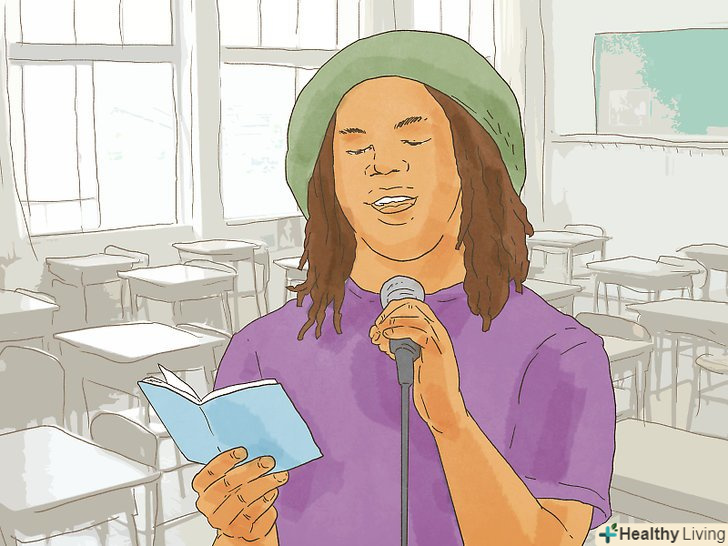 Практикуйтеся в повсякденному житті.відточуйте ораторські здібності кожен день, навіть якщо у вас немає спеціального завдання. Випробовуйте себе, кожен день виконуючи одну річ, яка викликає у вас дискомфорт, наприклад, підніміть руку на занятті, поговоріть з однокласником, якого ви погано знаєте, або замовте їжу по телефону, а не через Інтернет. Використовуйте ці виклики як можливість покращити навички публічних виступів.[3]- Наприклад, якщо ви знаєте, що схильні тараторити, використовуйте щоденні виклики, щоб практикуватися повільніше і чіткіше говорити. Якщо ви знаєте, що говорите тихо, тренуйтеся збільшувати гучність голосу.