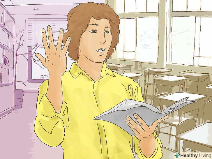 Станьте актором на час виступу.Актори говорять і роблять на сцені те, що вони ніколи б не подумали сказати або зробити в повсякденному житті. Це відбувається тому, що вони грають ролі персонажів. Думайте про себе як про персонажа, який багато в чому схожий на вас, але який дуже комфортно себе почуває під час публічних виступів. Входьте в роль, коли вам потрібно буде виступати перед класом.[12]- Деяким людям допомагає цей прийом, тому що, коли вони грають персонажів, їм легше ризикувати, знаючи, що якщо вони помиляться, то винен буде їх герой, а не вони самі.