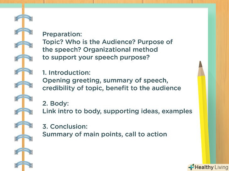 Приступите до роботи над промовою заздалегідь.будь занервує, якщо почне думати про тему тільки в ніч перед виступом. Почніть підготовку, як тільки дізнаєтеся про завдання. Подумайте, які моменти ви хочете включити в свою промову, і як краще організувати час.[5]- Необов'язково заучувати мову за кілька тижнів до встановленого терміну. Головне, не забувайте про терміни і дійте послідовно. Кожен день виділяйте трохи часу для роботи над презентацією.