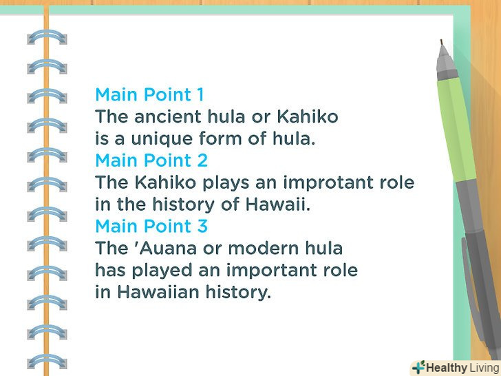 Зробіть нотатки з основними пунктами.можливо, це прозвучить парадоксально, але не варто просто зчитувати з аркуша всю свою промову. Краще зробіть замітки з основними пунктами плану і супроводите їх короткою уточнюючою інформацією. По можливості вмістіть все на одному аркуші паперу. Таким чином, вам не доведеться копатися в купі сторінок або карток.[6]- Наприклад, якщо ви будете виступати з доповіддю з історії, складіть план, де заголовки будуть відповідати назві і даті кожної події. Потім під кожним заголовком розпишіть дійових осіб і короткий зміст події.