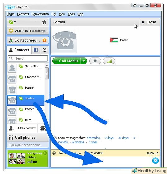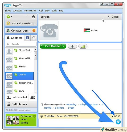 Виберіть одержувача повідомлення або введіть номер телефону.ви можете надіслати повідомлення будь-якій людині в Skype, навіть якщо його немає у вашому списку контактів, за умови, що вони вказали свій номер телефону в своєму профілі. Ви можете відправити одне і те ж повідомлення різним одержувачам, але за кожне відправлене повідомлення вам доведеться заплатити окремо.- Надішліть повідомлення.Внизу буде відображена вартість відправки повідомлення. Перед відправкою обов'язково зверніть на це увагу.