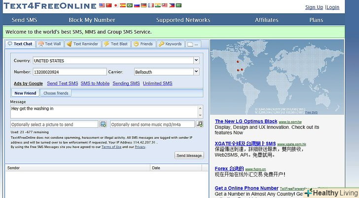 Знайдіть сайт, з якого можна відправляти текстові повідомлення абсолютно безкоштовно.у цьому способі вам не потрібно нічого завантажувати або встановлювати, хоча вам, можливо, доведеться зареєструватися на даному сайті. Приклад:- SeaSms.com.[2]