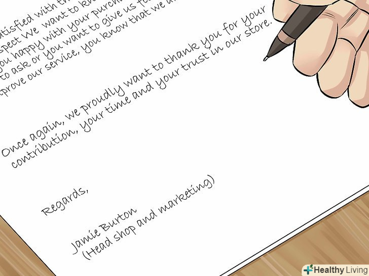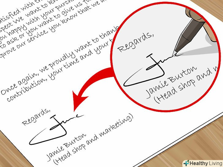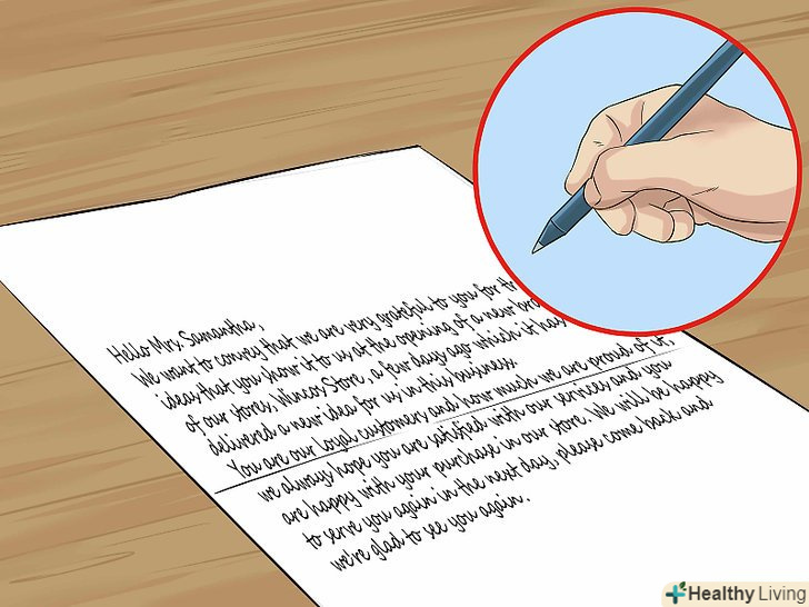 Підписуйте лист від руки.для кінцівки листа, обов'язково використовуйте ручний підпис. Великі корпорації часто приділяють величезну увагу тому, щоб лист звучало якомога більш індивідуально. Навіть виділена курсивом (або іншим шрифтом) підпис на комп'ютері створює ефект того, що лист відправлено особисто.{{#txtscrl:Sign the letter by hand|Dear Ms. Cross,Thank you so much for coming to the grand opening of the Whimsical Stationery Store’s Raleigh location on May 15, 2013. Because of you and all the other customers like you who share a passion for creative paper products, it was our largest grand opening in store history!Over a thousand of you stopped by to say hello and check out our new store, and we couldn’t be happier to welcome you all to our newest location. Please come back again soon; we’d love to see you!With gratitude for your kind patronage,|Donna DeaconFounder and CEO, Whimsical Stationery Store}}