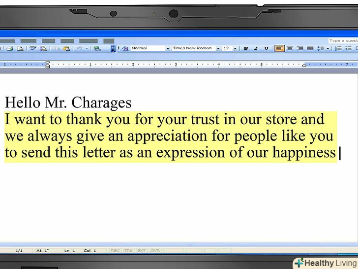 Вкажіть причину подячного листа.зробіть її якомога більше індивідуальної. Звичайно, можна просто написати" спасибі за вашу покупку", проте краще, якщо ви вкажіть, яку саме покупку здійснив покупець і який вид доставки вибрав. Так клієнт буде більше орієнтований мати справу ваше з вашою компанією, так як йому буде приємний такий індивідуальний підхід.{{#txtscrl:Identify the reason for the thank-you note|Dear Ms. Cross,|Thank you so much for coming to the grand opening of the Whimsical Stationery Store’s Raleigh location on May 15, 2013.}}- Ваша подяка повинна звучати максимально щиро. Ви можете додати короткі витяги з діалогу з клієнтом при покупці, щоб він бачив, що його пам'ятають.
