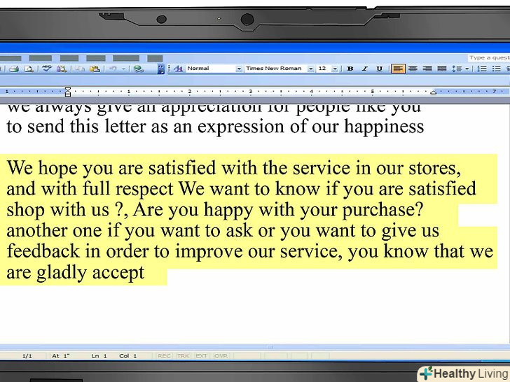 Додайте кілька супутні питань щодо контролю виконання сервісу.у подячному листі доречно задати кілька супутніх питань, щоб упевнитися, що всі потреби клієнта були задоволені, і що він залишився задоволений якістю обслуговування. Подібні уточнення підвищують шанси на те, що покупець до вас повернеться, а значить збільшитися і прибуток. Супровідні питання не обов'язково включати в лист подяки, проте з увагу ставитися до купівельних потреб – основна частина роботи в сфері обслуговування.{{#txtscrl:Do customer follow-up|Dear Ms. Cross,Thank you so much for coming to the grand opening of the Whimsical Stationery Store’s Raleigh location on May 15, 2013.|Because of you and all the other customers like you who share a passion for creative paper products, it was our largest grand opening in store history!}}- Висловіть надію, що покупець задоволений своєю покупкою, і додайте, що готові відповісти на всі його питання і пропозиції.