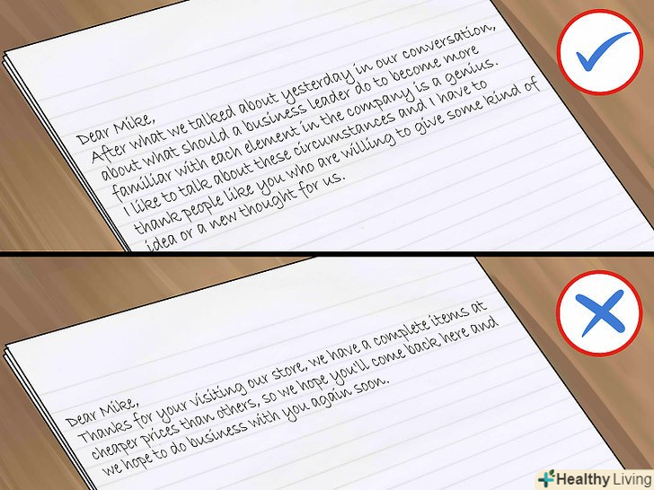 Пишіть лист від руки.друкувати стандартну форму-все одно, що відправляти рекламний проспект. Замість цього, ви повинні змусити клієнта відчути себе значущим, зрозуміти, що його цінують. Це свого роду зворотний ефект щодо роздратування від реклами. Пишіть листи подяки від руки і самостійно.- Якщо листів подяки занадто багато, попросіть співробітників допомогти вам. Витратити час на індивідуальний підхід варто того.