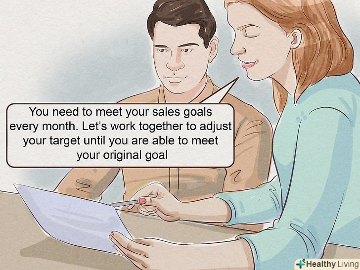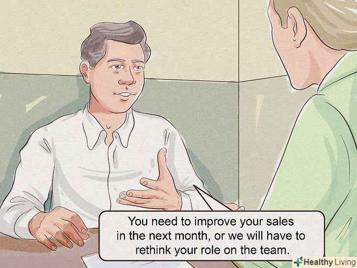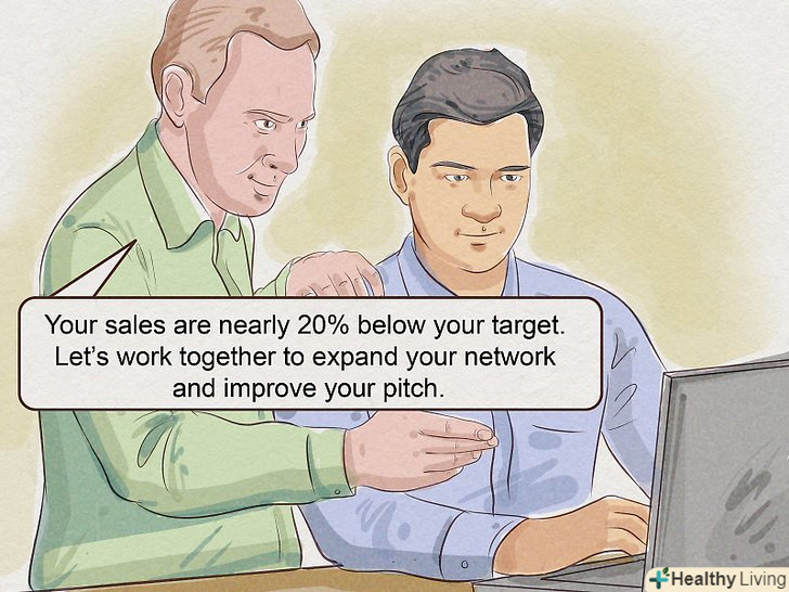 Надайте конструктивну критику.недостатньо просто вказати людині на те, що він робить неправильно. Конструктивна критика передбачає, що ви також повинні надати ідеї про те, як виправити ситуацію. Вкажіть людині на помилки, а потім повідомте, як їх усунути.[5]- Можна сказати: "ваші продажі майже на 20% нижче плану, і ви не досягали поставлених цілей протягом останніх трьох місяців. Давайте попрацюємо разом, щоб розширити вашу мережу клієнтів і підвищити рівень продажів».