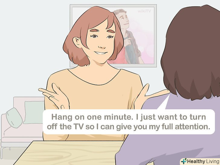 Концентруйте увагу на розмові і не відволікайтеся.насправді буде набагато простіше обмірковувати свої слова перед тим, як їх сказати, якщо ви не будете без кінця дивитися в свій телефон, в телевізор або комп'ютер. Відкладіть в сторону або вимкніть все, що відволікає вас від співрозмовника, постарайтеся сконцентрувати всю свою увагу на людині, з яким розмовляєте.[12]- Цілком нормально зробити невелику паузу, щоб просто прибрати всі відволікаючі речі в сторону. Можна сказати що-небудь таке: "слухай, почекай-но хвилинку. Хочу вимкнути телевізор, щоб уважно тебе вислухати».
