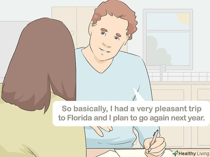 Постарайтеся зосередитися лише на одному конкретному моменті, доповнюйте інформацію в міру потреби.якщо ви збираєтеся відразу вивалити на людину великий обсяг інформації, все ж спробуйте сконцентруватися на якомусь певному пункті, поступово доповнюючи кожен прикладом, якщо буде потрібно. Потім зробіть хвилинну паузу, щоб у вашого співрозмовника була можливість висловити свою думку або задати питання, після чого можна додати нову порцію інформації.[14]- Наприклад, якщо людина цікавиться, як пройшов ваш день, можна почати з того, що в цілому він був непоганим, а потім просто назвати щось конкретне, що сталося за день, а не переказувати всі події.
