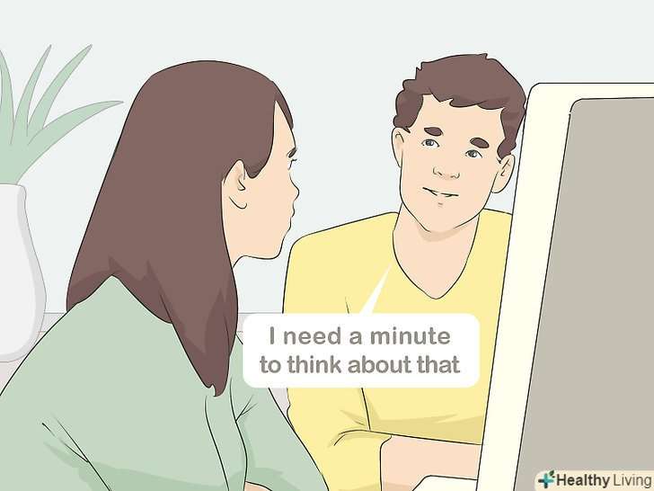 Якщо ситуація напружена, зробіть кількаГлибоких вдихів і видихів або знайдіть можливість піти.якщо ви встряли в суперечку або в занадто спекотну розжарену бесіду, якщо ви просто переживаєте і нервуєте — зробіть кілька глибоких вдихів і видихів. Це хороший спосіб заспокоїтися, зібратися з думками і виграти трохи часу. Зробіть глибокий вдих через ніс (на рахунок 1-2-3-4), потім затримайте дихання на 4 секунди і видихніть повільно через рот на рахунок 1-2-3-4.[11]- Якщо вам потрібно ще більше часу, щоб заспокоїтися і прийти в себе, Принесіть вибачення і вийдіть в туалет або кімнату відпочинку, або просто прогуляйтеся по будівлі.
