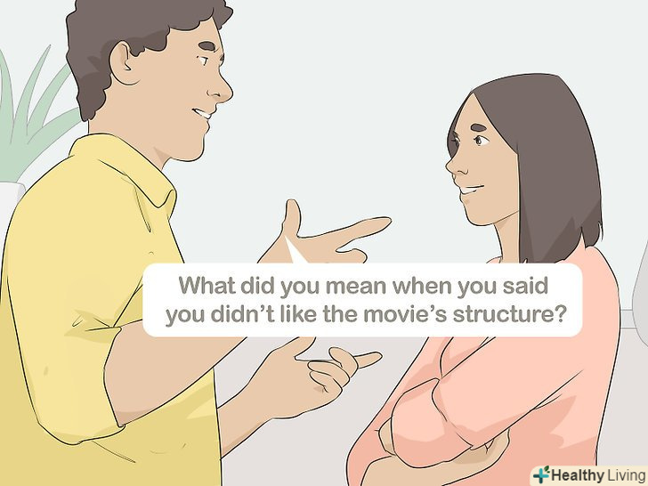 Задавайте зустрічні питання, щоб уточнити, що вам тільки що повідомив співрозмовник.якщо ви з кимось розмовляєте і не знаєте напевно, як відповісти або прокоментувати тільки що сказане, просто попросіть уточнити той чи інший момент. Можна перефразувати якусь частину його розповіді або питання, яке вам було поставлено — перевірте, наскільки правильно ви його зрозуміли.[10]- Наприклад, можна сказати щось таке « " а що ти мав на увазі, кажучи, що тобі не сподобалася структура фільму?»