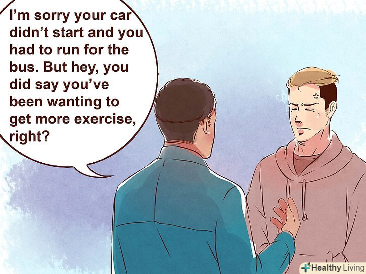 - Використовуйте гумор. Одягання негативу в гумористичну оболонку здатне протистояти імпульсивної спробі мозку в ситуації, що склалася сконцентруватися на негативі.[5] наступного разу, коли ваш друг почне прорікати чергову негативну тираду, парируйте її своїм гумором: "я шкодую, що у тебе не завелася машина і тобі довелося бігти за автобусом. Але ж ти ж сам говорив, що хотів більше займатися спортом, адже так?"