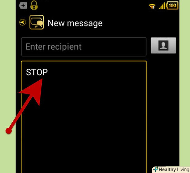 Спробуйте надіслати повідомлення з текстом " STOP." "STOP" є найпоширенішим кодом відмови від мобільної реклами. Якщо ви отримуєте небажані повідомлення від Постачальника послуг, які ви використовуєте, спробуйте цей метод. Це необов'язково спрацює, але спробувати варто – це швидко і просто. Шкоди від цього не буде, і ви заощадите час, якщо не будете висіти на телефоні, дізнаючись інформацію про те, як заблокувати номери.- Якщо до ваших повідомлень автоматично додається «підпис», переконайтеся, що ви стерли її, перед відправленням.