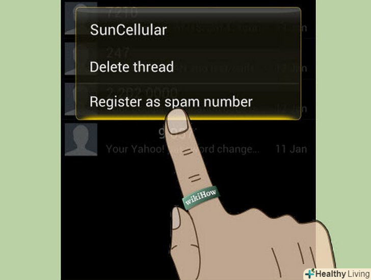 Відкрийте свої вхідні повідомлення. Виберіть небажане повідомлення. З'явиться спливаюче меню. Виберіть "зареєструвати номер як спам". Повідомлення, які будуть приходити з цього номера, будуть перенаправлені в спам, і ви не будете отримувати повідомлення, коли вони будуть приходити.- Конкретні кроки для цього способу будуть відрізнятися в залежності від операційної системи Android. У вашого телефону може не бути такої функції - якщо це так, шукайте додаток для блокування смс(див. нижче).