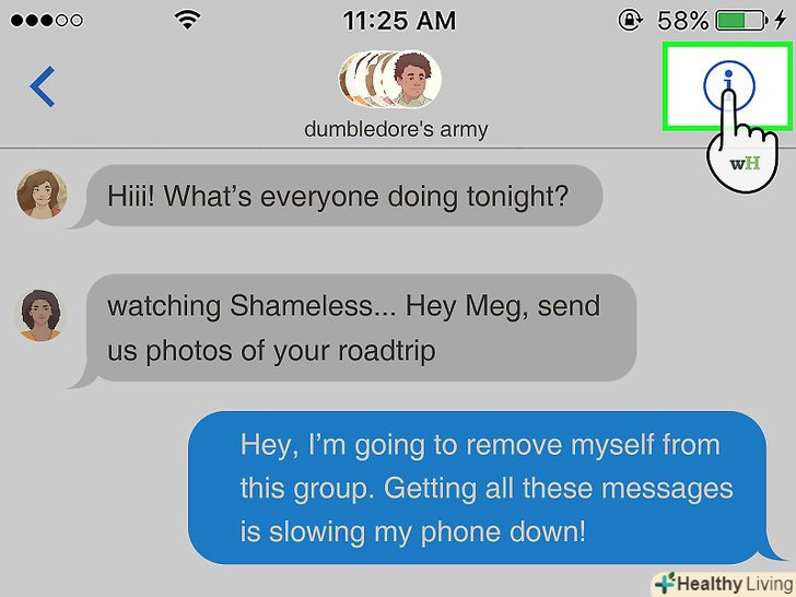 Вийдіть з групового чату.перш ніж різко залишати бесіду, надішліть повідомлення, щоб повідомити інших учасників про свій відхід. Не потрібно пояснювати причину, просто якщо ви позначите свій догляд, вас не будуть додавати повторно в цей або в майбутні групові чати. [10]- Можна сказати щось на кшталт: "Привіт, я збираюся вийти з цієї групи. Повідомлень приходить так багато, що це гальмує роботу мого телефону!»