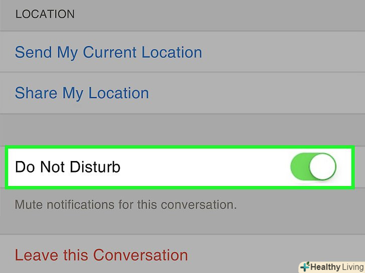 Увімкніть режим "не турбувати", щоб залишитися в групі, але не отримувати повідомлення. Функція» не турбувати " відключає повідомлення, що приходять з групової листування, але дозволяє переглядати повідомлення і відповідати на них у вільний час. Цю функцію можна знайти в меню з інформацією або на нижній панелі. [14]- Якщо ви захочете знову отримувати повідомлення з чату, просто поверніть налаштування в початкове положення.