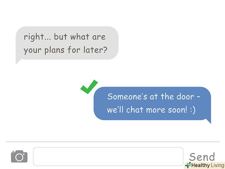 Вибачтеся, сказавши, що ви збираєтеся зайнятися чим-небудь. після обміну кількома повідомленнями з людиною, вибачитеся, сказавши що-небудь на кшталт: "збираюся на тренування, хочу позайматися годинку. Було приємно поспілкуватися!» Це дасть співрозмовнику зрозуміти, що ви, швидше за все, не будете відповідати на його повідомлення деякий час.[1]- Обов'язково підлаштовуйте свої відповіді під того, з ким ви спілкуєтеся. Якщо ви обмінюєтеся повідомленнями з колегою, можна сказати щось на кшталт: "Я збираюся готувати вечерю. Побачимося на роботі в понеділок!»