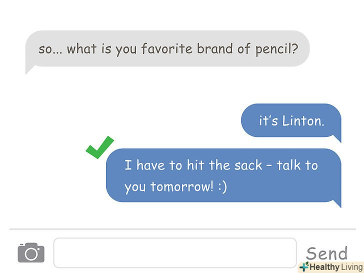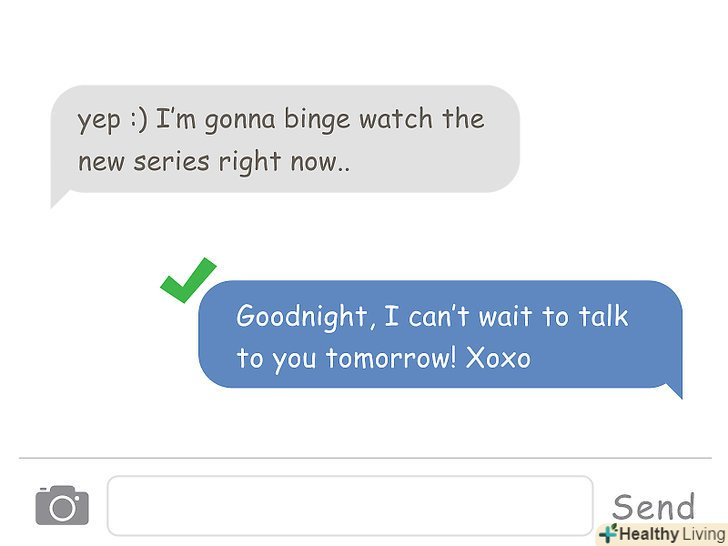 Завершіть розмову на кокетливій ноті за допомогою милого коментаря або смайлика.настане час закінчити розмову з коханою людиною, дійте легко і невимушено! Використовуйте смайлики, такі як поцілунок або смайлик з сердечками на очах, і дайте людині зрозуміти, що ви думаєте про нього, навіть якщо не можете вести діалог.[6]- Перш ніж лягти спати, скажіть щось на кшталт: "На добраніч. Мені не терпиться поспілкуватися з тобою завтра! Цілую", - або: "солодких снів!»