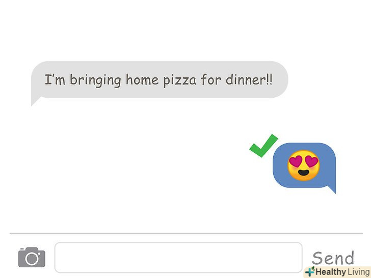 Якщо доречно, дайте відповідь одним-двома смайликами.при спілкуванні з людиною, яку Ви часто бачите Наживо, відповідь за допомогою смайликів-це відмінний спосіб призупинити розмову, поки ви не зустрінетеся. Обов'язково переконайтеся, що смайлик є доречною відповіддю на його твердження, перш ніж натискати»відправити"![4]- Наприклад, якщо ваш сусід по кімнаті пише вам: "я принесу піцу на вечерю!"— - можна відповісти за допомогою смайлика з сердечками в очах або з піднятим вгору великим пальцем, щоб повідомити йому, що ви побачили повідомлення і перебуваєте в передчутті.