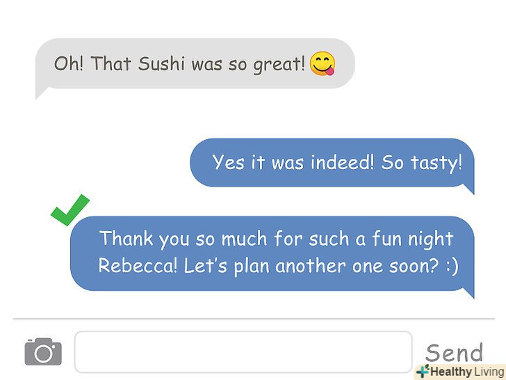 Подякуйте йому за гарне проведення часу, якщо ви були на побаченні.чекати, коли хлопець напише після побачення, — це вже минуле століття. Якщо ви листувалися після побачення, завершіть розмову, подякувавши його за відмінний вечір і запропонувавши повторити. [8]- Наприклад, можна сказати що-небудь на кшталт: "Велике спасибі за такий веселий вечір! Давай заплануємо ще один найближчим часом?»