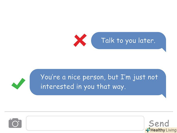 Невимушено завершіть розмову, якщо людина вам нецікавий.переписувати з шанувальником / шанувальницею може бути непросто. Намагайтеся відповідати дружелюбно, але прямолінійно. Якщо ви не хочете спілкуватися з людиною, дайте йому зрозуміти, що він вам не цікавий і завершите розмову.[9]- Наприклад, якщо він покличе вас куди-небудь, можна сказати що-небудь на кшталт: «ти хороша людина, але я просто не зацікавлена в романтичних відносинах з тобою».