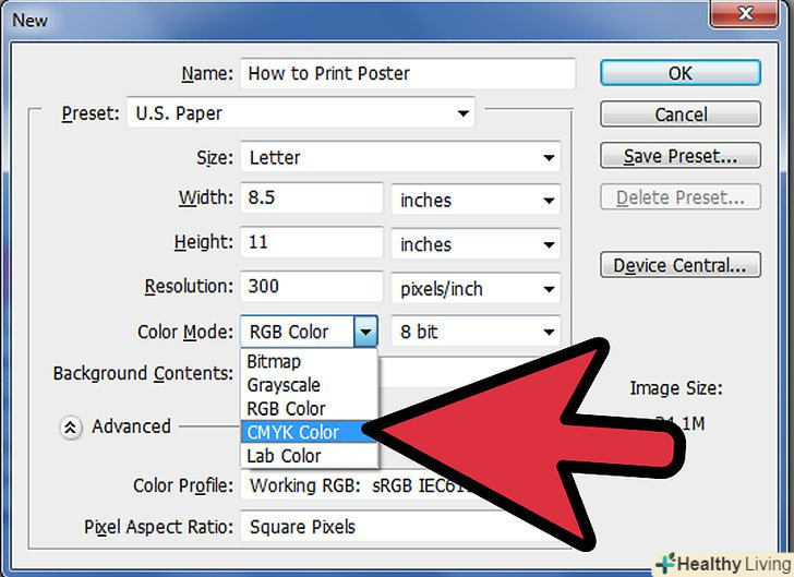 Виберіть колірну схему CMYK так як за замовчуванням варто RGB.більшість принтерів працює на колірній схемі CMYK і якщо ваш плакат збережений в RGB, то ви отримаєте Спотворені кольори. Кольори будуть спотворені в межах відтінків, але відмінності ви помітите.