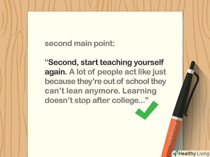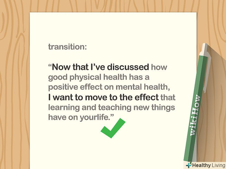 Перейдіть до наступного пункту. повідомте всі відомості, які ви хотіли викласти в першому пункті, після чого поверніться до верхнього рівня плану і придумайте плавний перехід до нової ідеї (одне-два речення).[9]- Не ускладнюйте переходи. Зайві витівки ні до чого. Якщо не вдається придумати конкретний перехід, то можна обійтися загальною фразою.