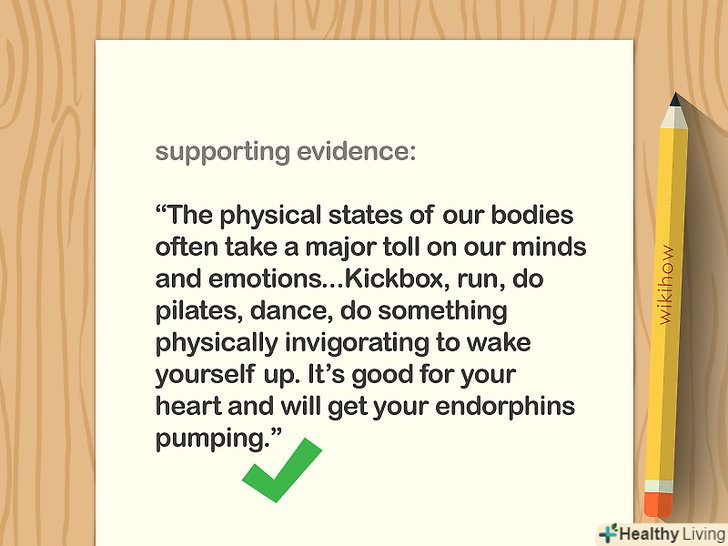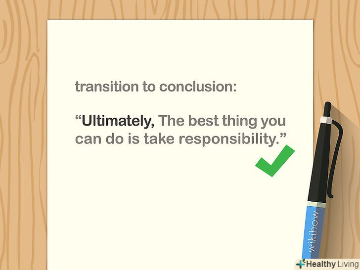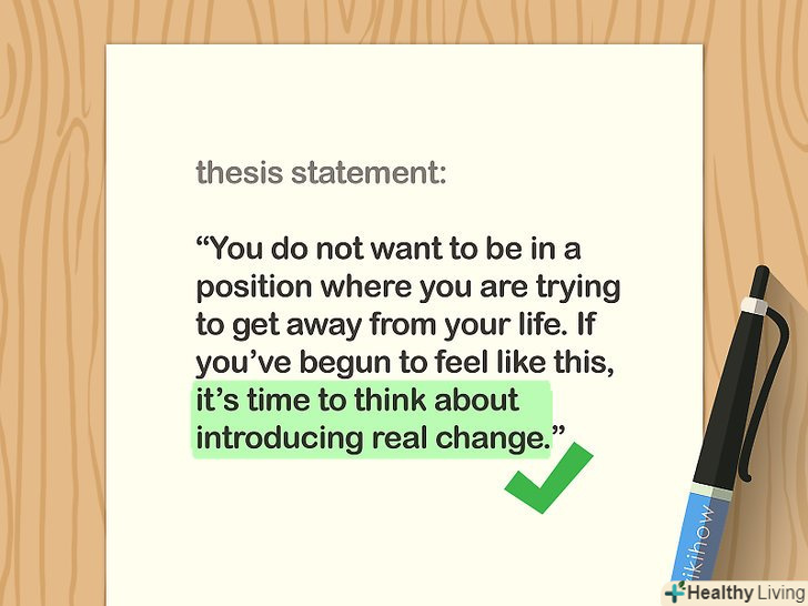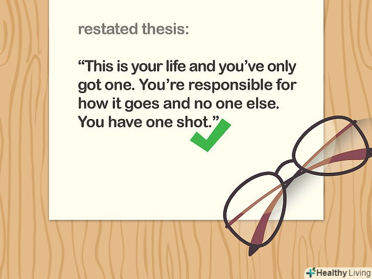 Заново сформулюйте тезу.ця версія тези повинна звучати як висновок і кінцевий підсумок, а не припущення з введення.[13]- Якщо все пройшло добре, то ви повністю підтвердили тезу і довели його важливість. Слід повернутися до підсумку розглянутих пунктів і сформулювати переконливе твердження.