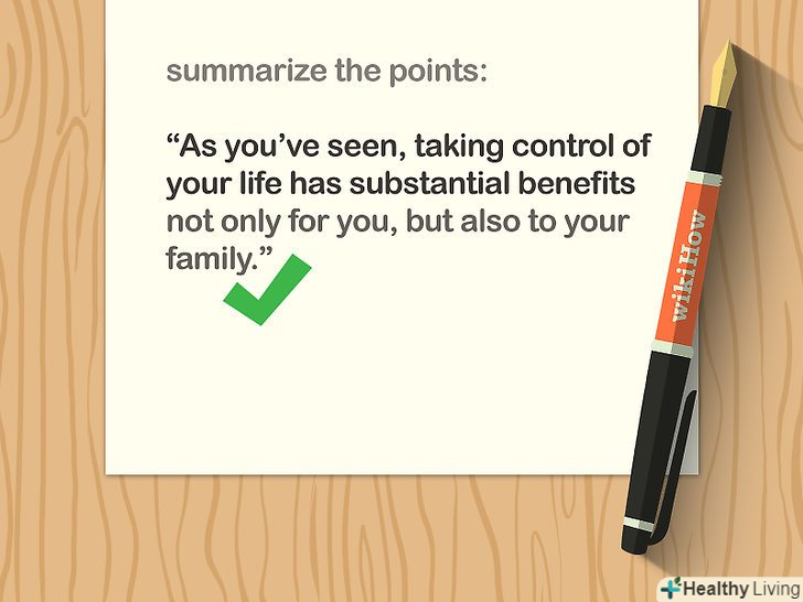 Резюмуйте розглянуті пункти.фахівці з підготовки презентацій часто описують організацію мови так:»повідомте, що ви збираєтеся розповісти, скажіть мова і скажіть, про що ви говорили". Почніть завершальну частину з переказу попередніх пунктів.[12]- Не потрібно вдаватися в подробиці, просто підведіть короткий підсумок сказаного раніше.