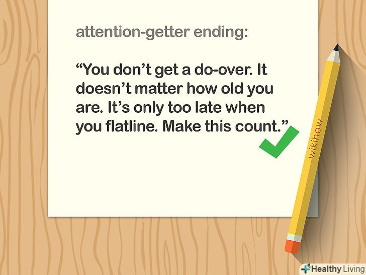 Використовуйте запам'ятовується деталь.в кінці мови використовуйте такий же прийом, як і на самому початку. Розкажіть випадок з життя або забавну історію, які дозволять підкреслити важливість основної ідеї.[14]- Наприклад, можна повідомити слухачам несподіване продовження історії, якою ви почали свою промову.