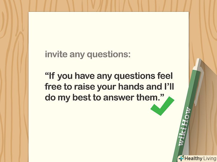 Передбачте час для запитань.заздалегідь обговоріть з організаторами можливість питань і відповідей. Якщо ви маєте намір відповідати на питання, зробіть позначку в своєму плані в кінці мови.[15]- Якщо ви хочете окреслити параметри питань, то перерахуйте деталі в плані, щоб озвучити їх слухачам перед сеансом питань і відповідей.