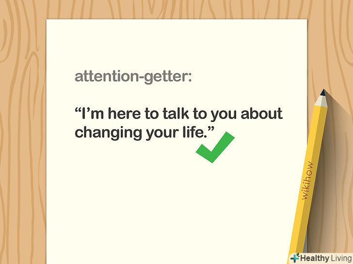 Приверніть увагу слухачів.важливо привернути і утримувати увагу присутніх протягом всієї промови. Можна використовувати жарт, історію з життя або незвичайне спостереження по темі виступу, яке не буде більш доречним в подальшій промові.[2]- Вибирайте відповідний прийом з урахуванням присутніх. Що може захопити слухачів? Це необов'язково має здаватися цікавим або веселим особисто вам.
