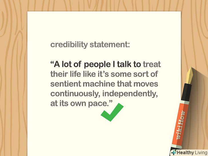 Доведіть свій авторитет.ви виклали свою точку зору, але слухачам важливо знати, чому вони повинні довіряти вам. Необов'язково використовувати офіційні підтвердження на зразок вашого наукового ступеня або тривалості дослідження. Іноді цілком доречна історія з життя.[5]- Якщо ви вимовляєте промову перед класом в школі, то можна повідомити, що ви вивчали предмет і проводили дослідження.