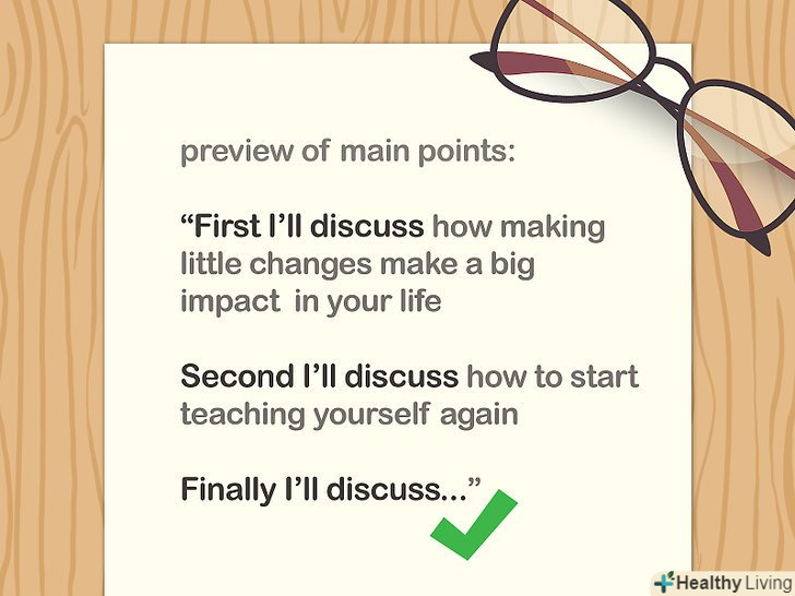 Попередньо уявіть основні пункти мови.слухачі повинні знати, про що ви будете говорити, з якою метою і чому вони повинні слухати вас. Коротко викладіть основні пункти на початку виступу.[6]- Єдиного правила не існує, але зазвичай мова складається з трьох частин. Перерахуйте всі частини у вступі в тому порядку, в якому вони будуть представлені в мові. Порядок зазвичай залежить від типу мови.